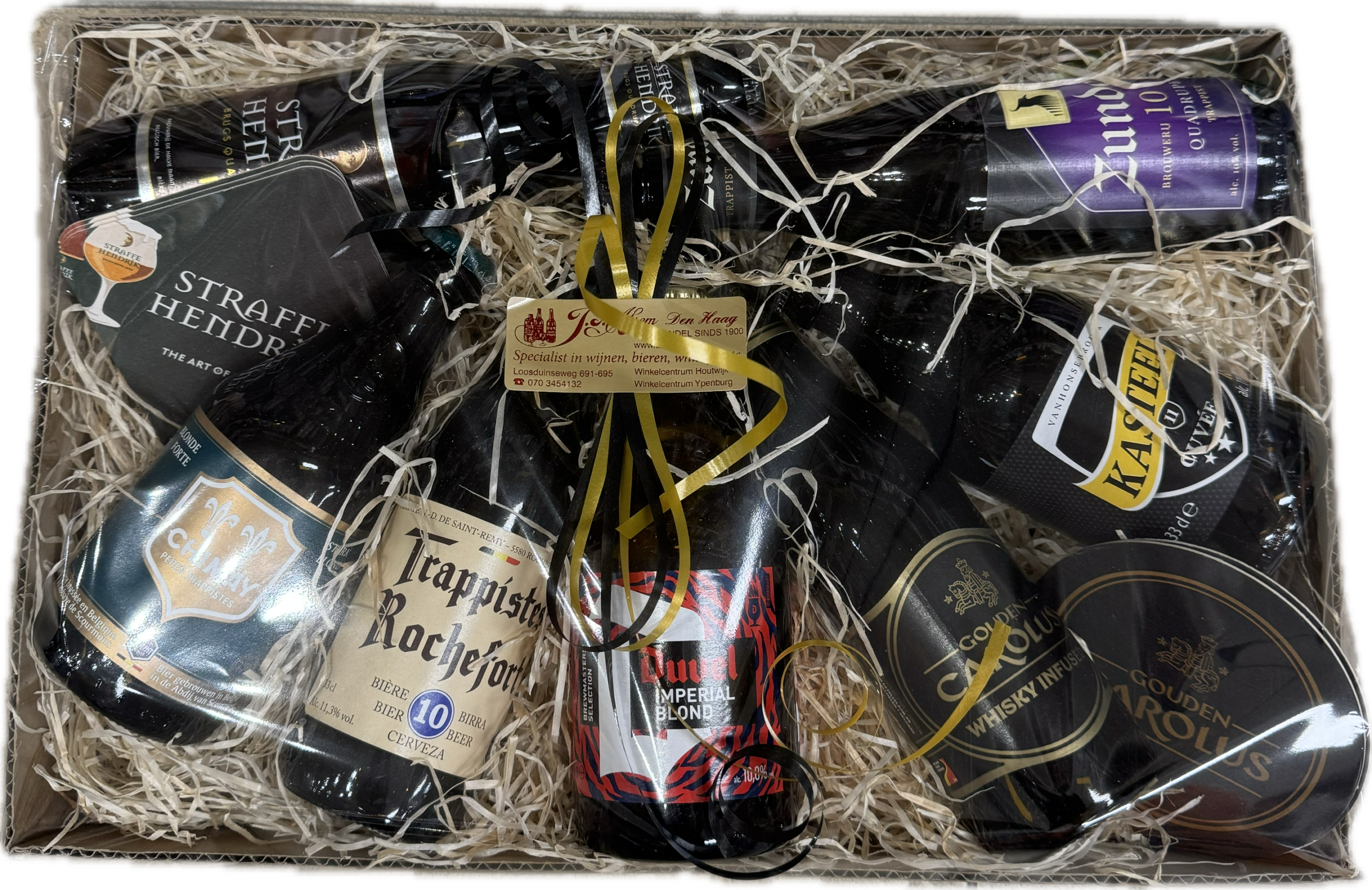 Dit pakket bevat: Straffe Hendrik Quadruppel, Chimay Groen Sterk Blond, Rochefort 10, Duvel Imperial Blond, Gouden Carolus Whiskey Infused Dark, Kasteel Cuvee en Zundert 10 Quadruppel.